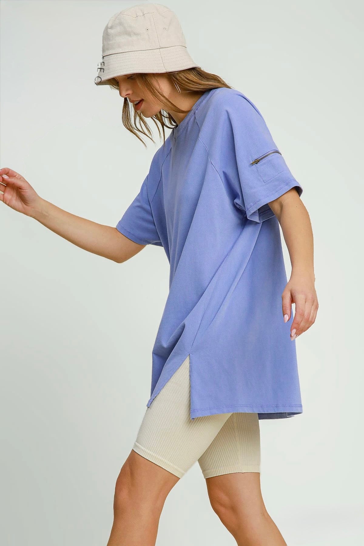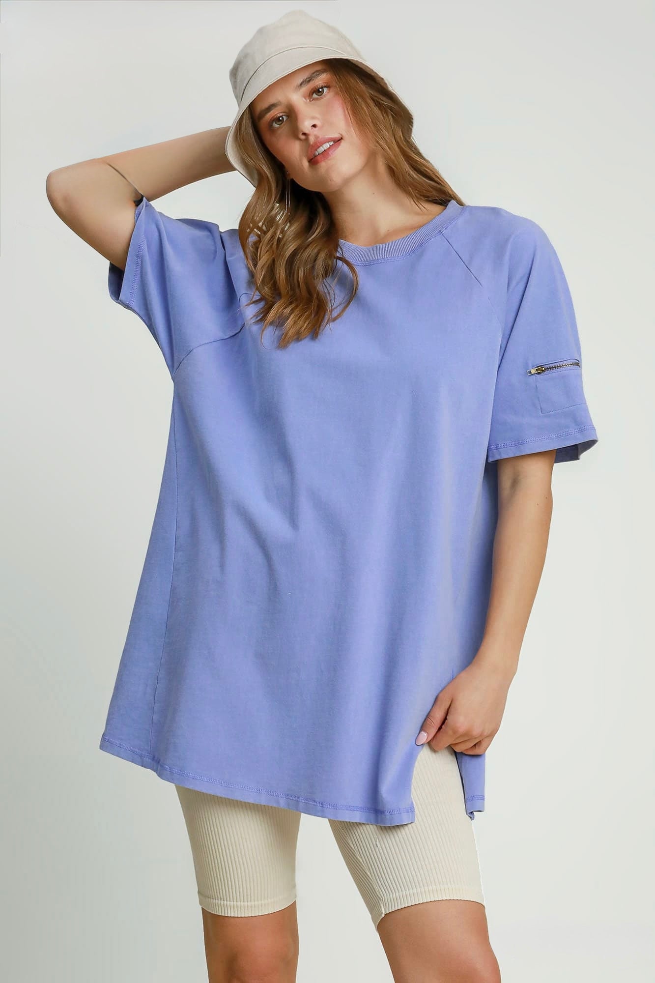 This Top offers a modern take on a casual essential. Designed with classic raglan sleeves for a relaxed fit, this top features a subtle rinse wash for a soft, lived-in look. A functional zipper detail on the sleeve adds a touch of edge, while side slits provide ease of movement and a flattering drape.