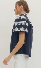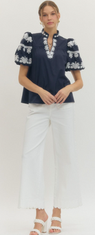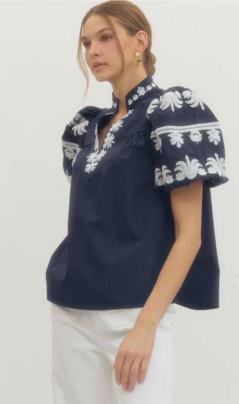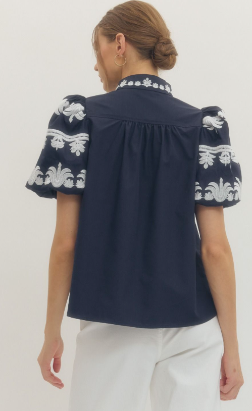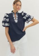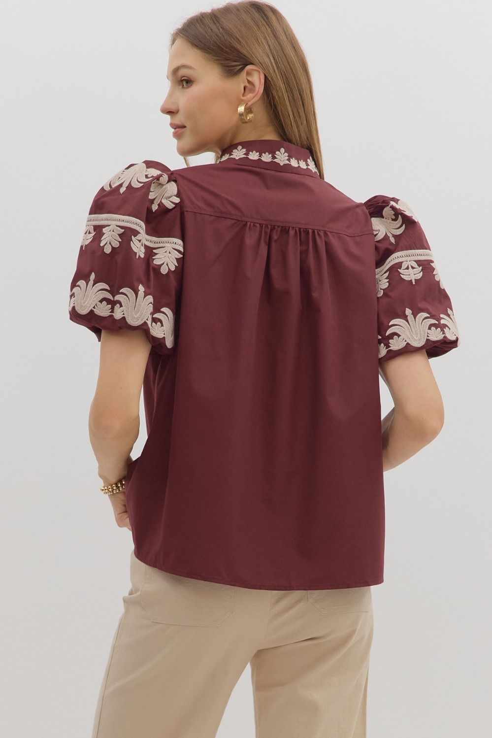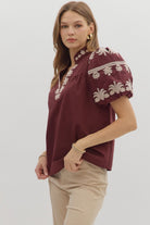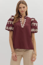 A timeless staple with a touch of charm. This solid V-neck pullover features a chic band collar and a beautifully embroidered placket for just the right amount of detail. The short bubble sleeves add a playful silhouette, while the lightweight woven fabric keeps it comfortable and breathable. Unlined and non-sheer, it’s a versatile piece that can be dressed up or down with ease.