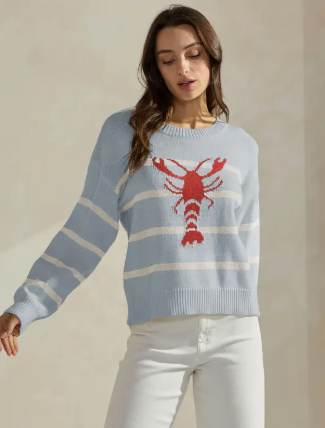 A playful blue and white striped sweater featuring a charming lobster motif for a fun, coastal-inspired look. Crafted from a soft, cozy knit, this sweater blends classic stripes with a whimsical detail that adds personality without feeling overdone. Comfortable and easy to style, it’s perfect for layering or wearing on its own, bringing a fresh, nautical touch to everyday outfits.