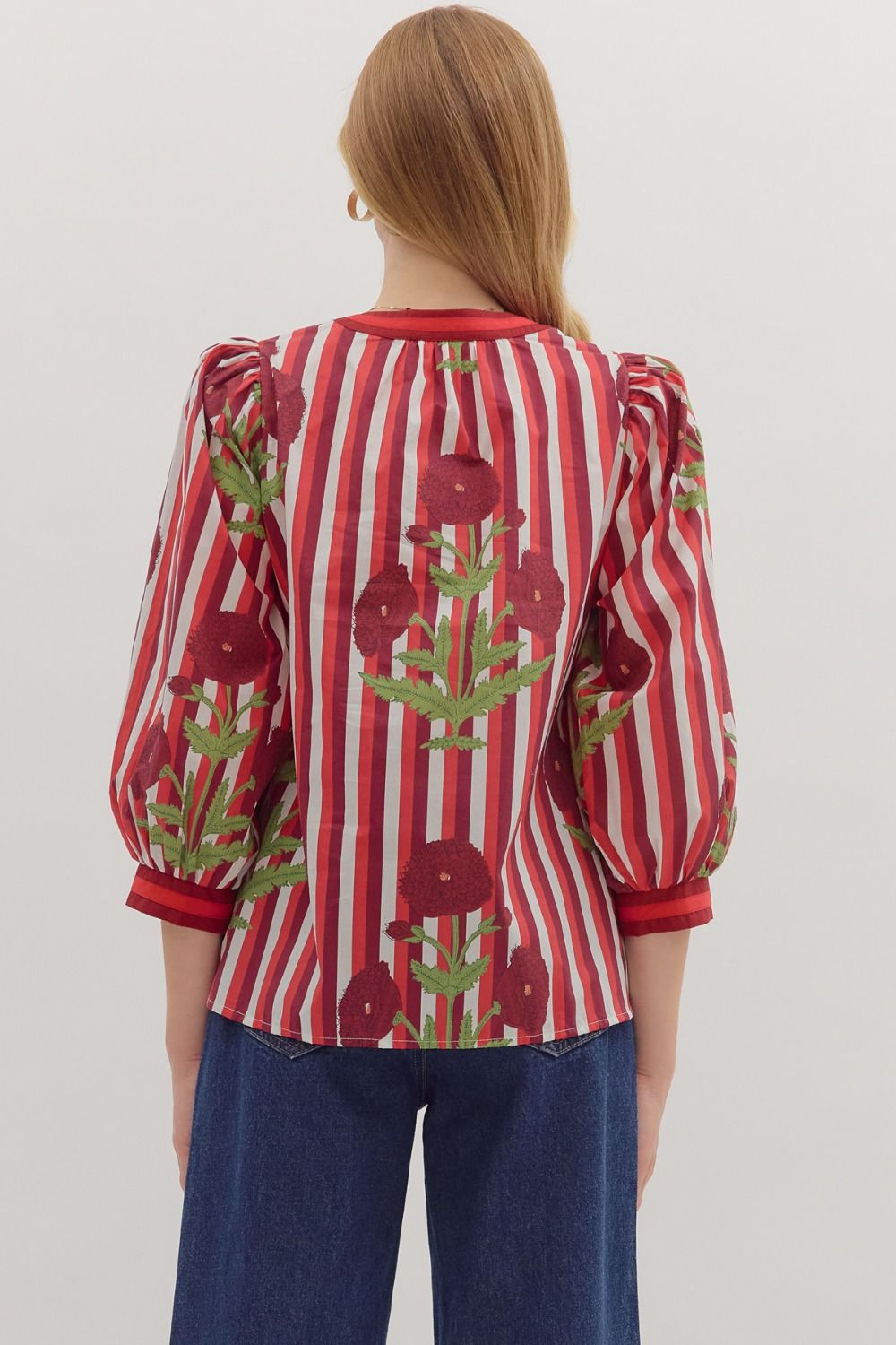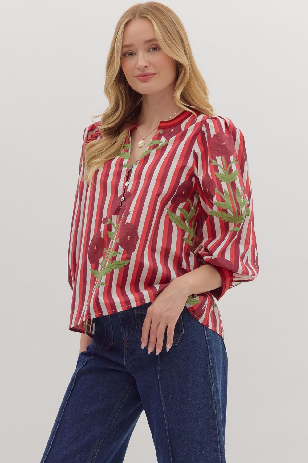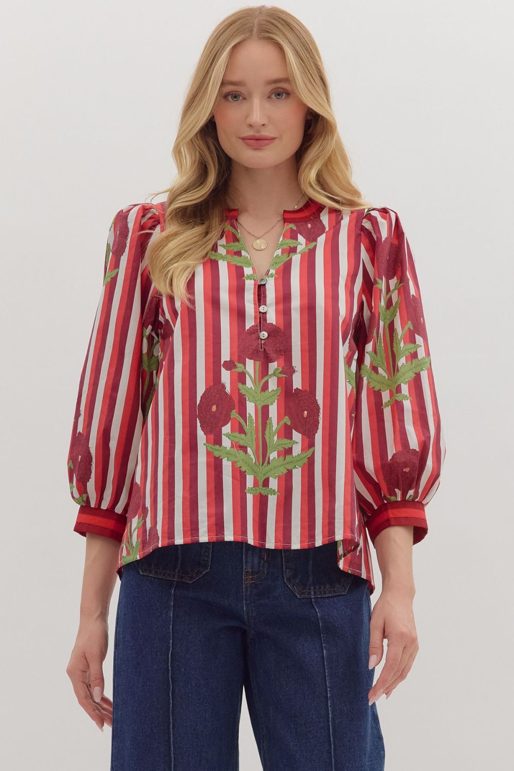 Playful stripes meet delicate florals in this charming 3/4 sleeve blouse. Designed with a front button closure and bold contrast cuffs, it’s the perfect mix of classic and fresh. Lightweight and woven, this non-sheer piece is effortless to style and comfortable to wear all day long.