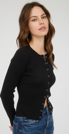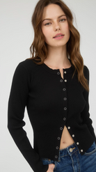 Cozy up in the sweetest layer of the season—this black snap button-down knit top is a fall must-have. With its classic round neckline and soft, comfy knit, it’s the perfect piece to throw on when the temps start to dip. Wear it buttoned up with high-rise denim and booties for a polished look, or leave it open over a graphic tee or fitted tank for a laid-back, casual vibe. Add a felt hat, gold jewelry, and your favorite fall drink, and you’ve got autumn style on lock!