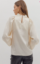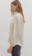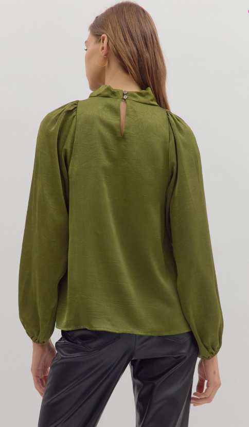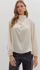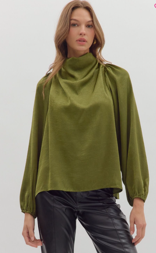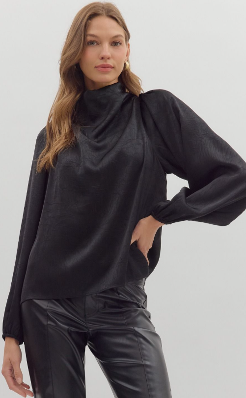 Sophisticated and sleek, this solid long sleeve top features a softly draped mock neck and a back keyhole with a button enclosure for an elevated touch. Crafted from a lightweight woven fabric with a subtle shimmer. Perfect for pairing with tailored trousers or denim, this top effortlessly transitions from day to night.