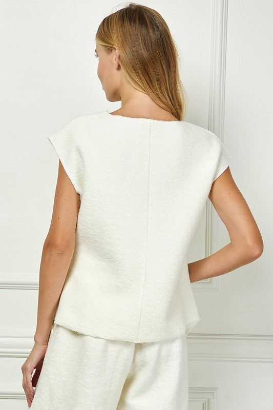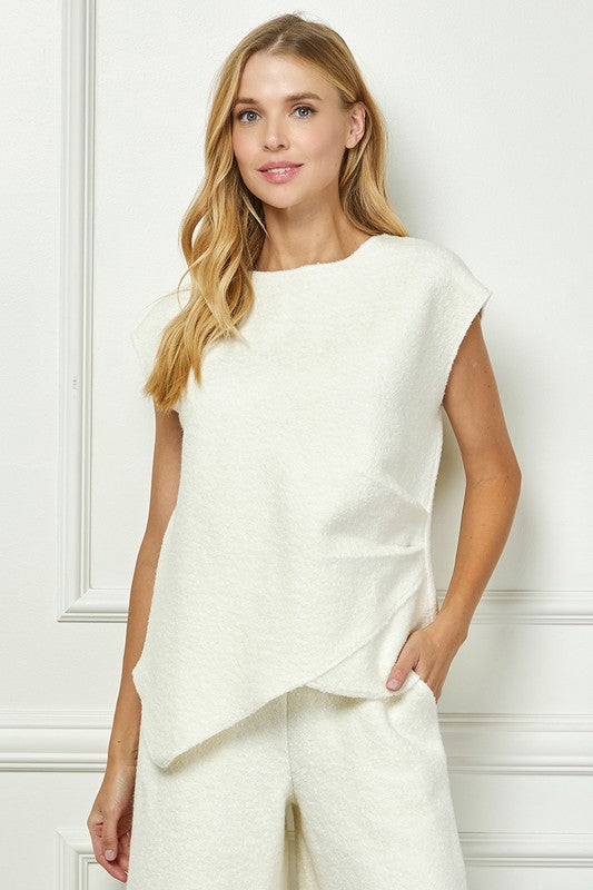 This cream round neck top is effortlessly chic with its relaxed drop shoulder fit and playful asymmetric hemline. Made from a soft blend of 80% polyester and 20% cotton, it’s breathable yet holds its shape beautifully. The subtle cap sleeves add just the right touch of femininity, making it a versatile piece that can easily be dressed up or down.