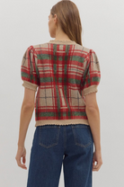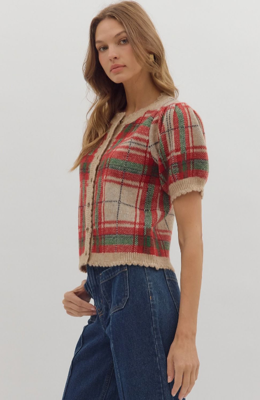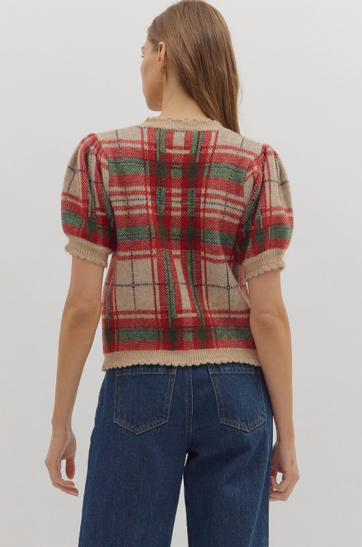 Cozy meets chic in this plaid short puff sleeve sweater knit top. The scalloped neckline adds a feminine twist, while the front button closure gives it a polished touch. Crafted in a medium-weight knit that’s unlined, non-sheer, and easy to wear, this piece pairs perfectly with denim or skirts for a put-together look with just the right amount of charm.
