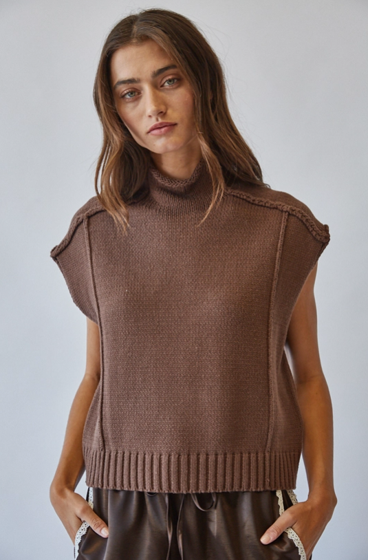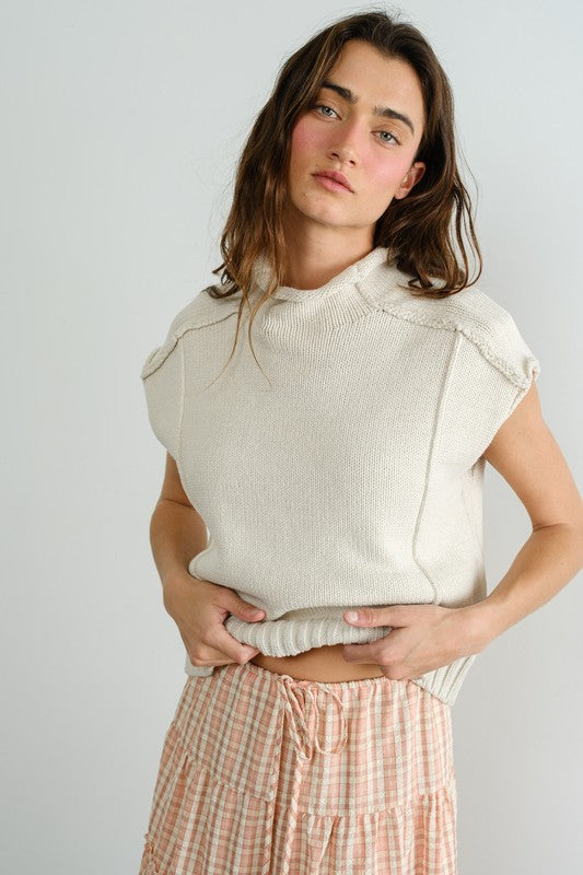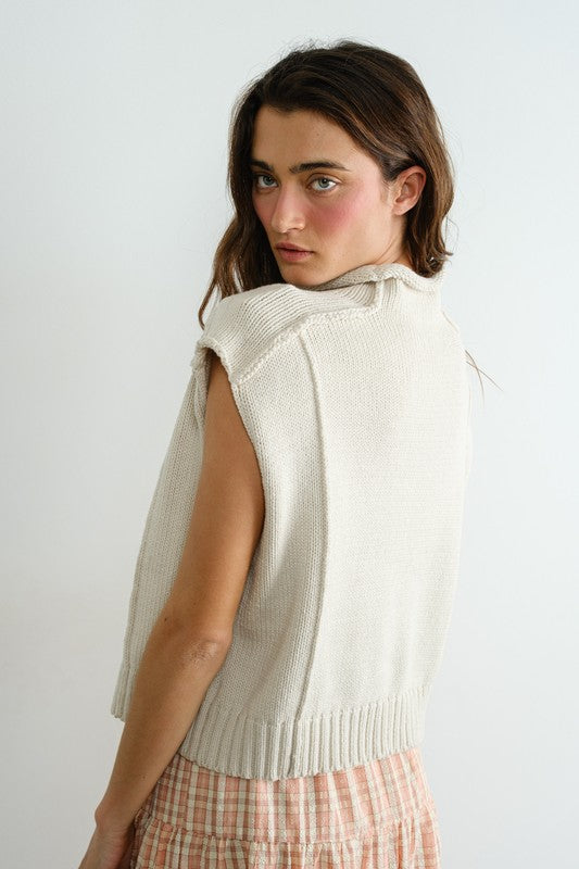 Elevate your layers with this cream-colored seam detail knit vest—sleek, minimal, and effortlessly chic. Featuring a sleeveless cut, a structured high collar, and ribbed trim for a tailored finish, this piece is the perfect blend of cozy and cool. The exposed seam details add a subtle edge, making it a standout staple for transitional weather. Style it solo with wide-leg trousers or layer it over a crisp button-down for a fall-ready vibe.