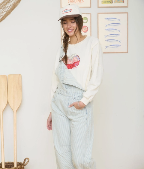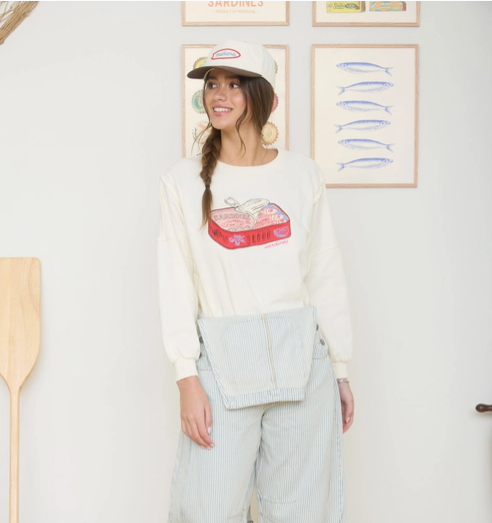 Add a touch of whimsy to your knitwear collection with this sardines graphic long sleeve sweater. Designed in a soft, cozy knit, it features a charming sardine-inspired graphic that brings a fun, playful edge to a classic silhouette. The long sleeves and relaxed fit make it perfect for layering or wearing on its own, while the lightweight feel keeps it comfortable for everyday wear. Pair it with denim, trousers, or skirts for an effortlessly cool look.