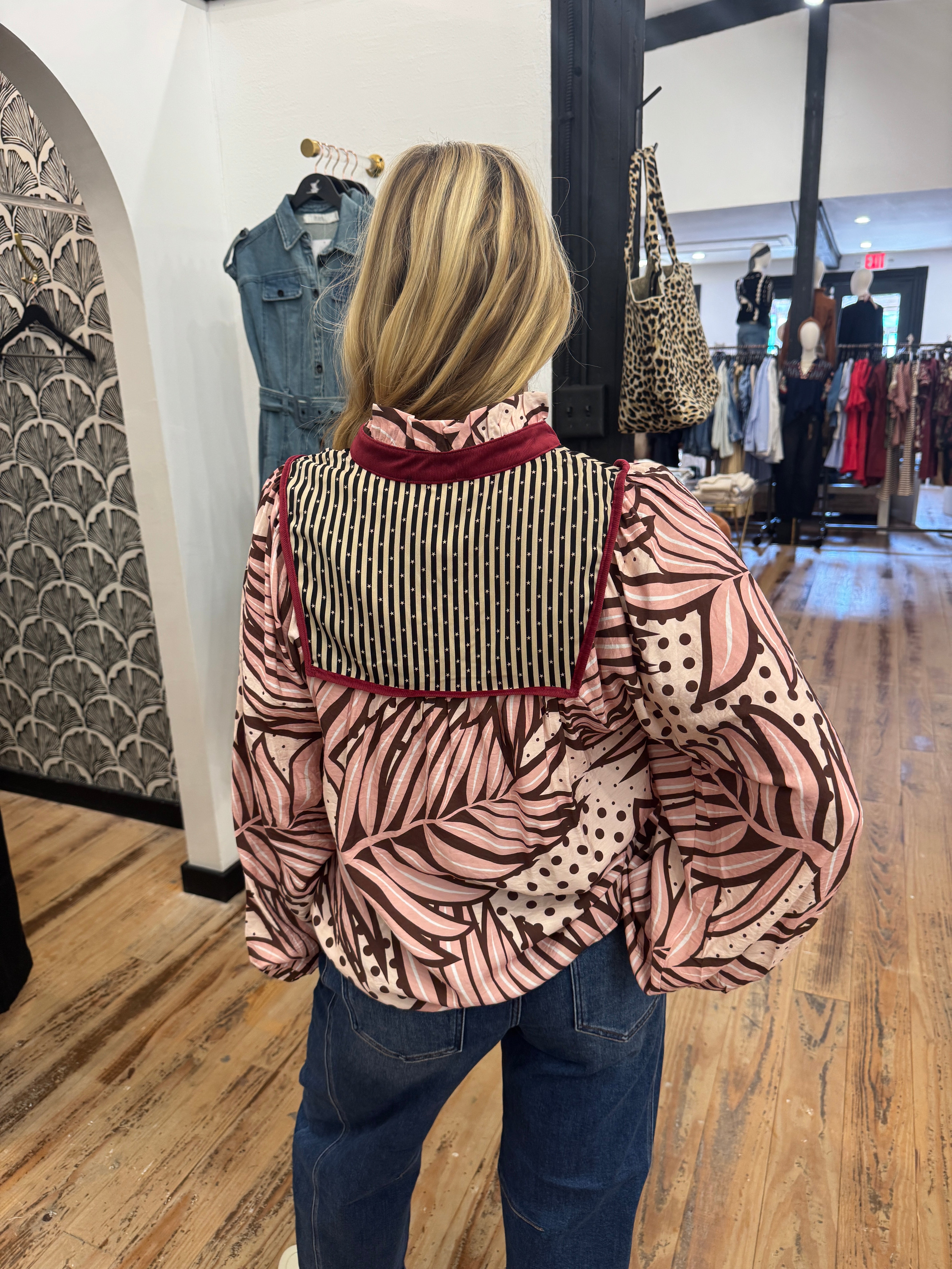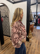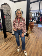 Bring a pop of playful energy into your fall wardrobe with The Kaleidoscope Top by THML. This long-sleeve beauty blends pink, brown, and an array of lively hues in a mix of eclectic patterns that feel both bold and effortless. With its vibrant design and cozy feel, it’s the perfect statement piece to pair with denim or layer under a jacket as the seasons shift. Fun, colorful, and uniquely you—this is fall style at its most joyful.