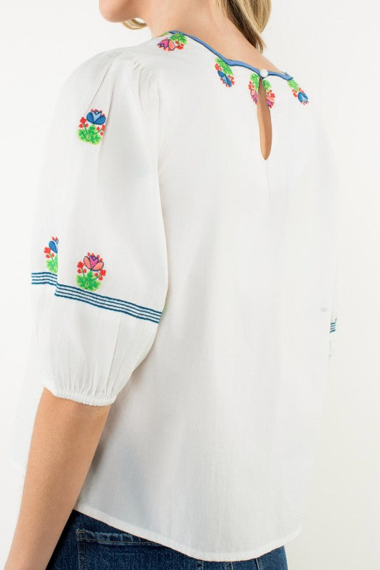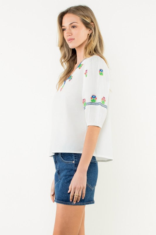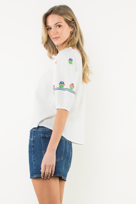 This white short-sleeved embroidered top by THML is the definition of simple and sweet. Featuring delicate floral embroidery across the front, it’s a clean, classic look with just the right amount of detail. The fit is easy and flattering, and like everything from THML—one of our forever favorite brands—it’s beautifully made and built to last.