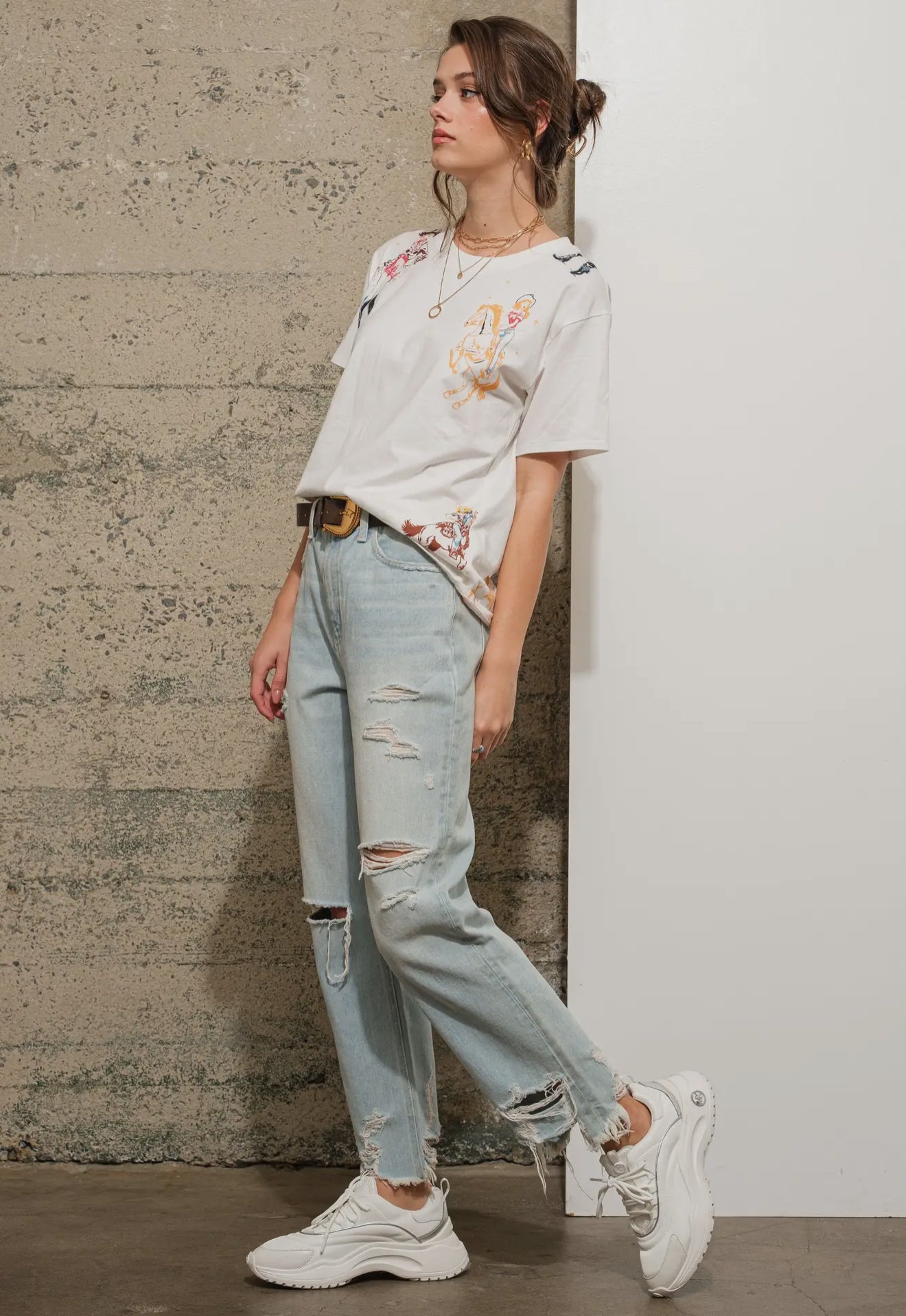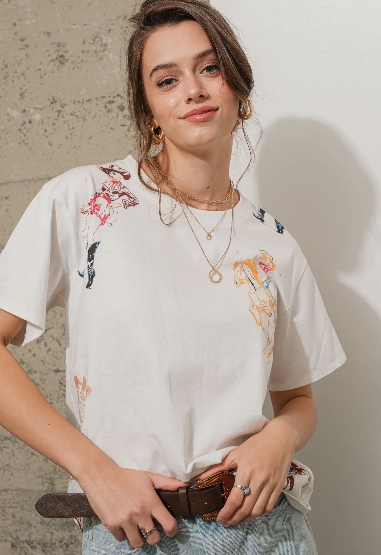 White western-motif graphic tee featuring a bold, vintage-inspired design that celebrates the spirit of the wild west. Think desert landscapes, cowboy boots, or rodeo graphics accented with rustic fonts and distressed details. The soft cotton fabric gives it that perfectly lived-in feel, making it an easy everyday piece to style with denim shorts, your favorite jeans, or a fringed jacket.