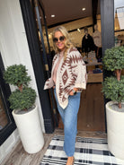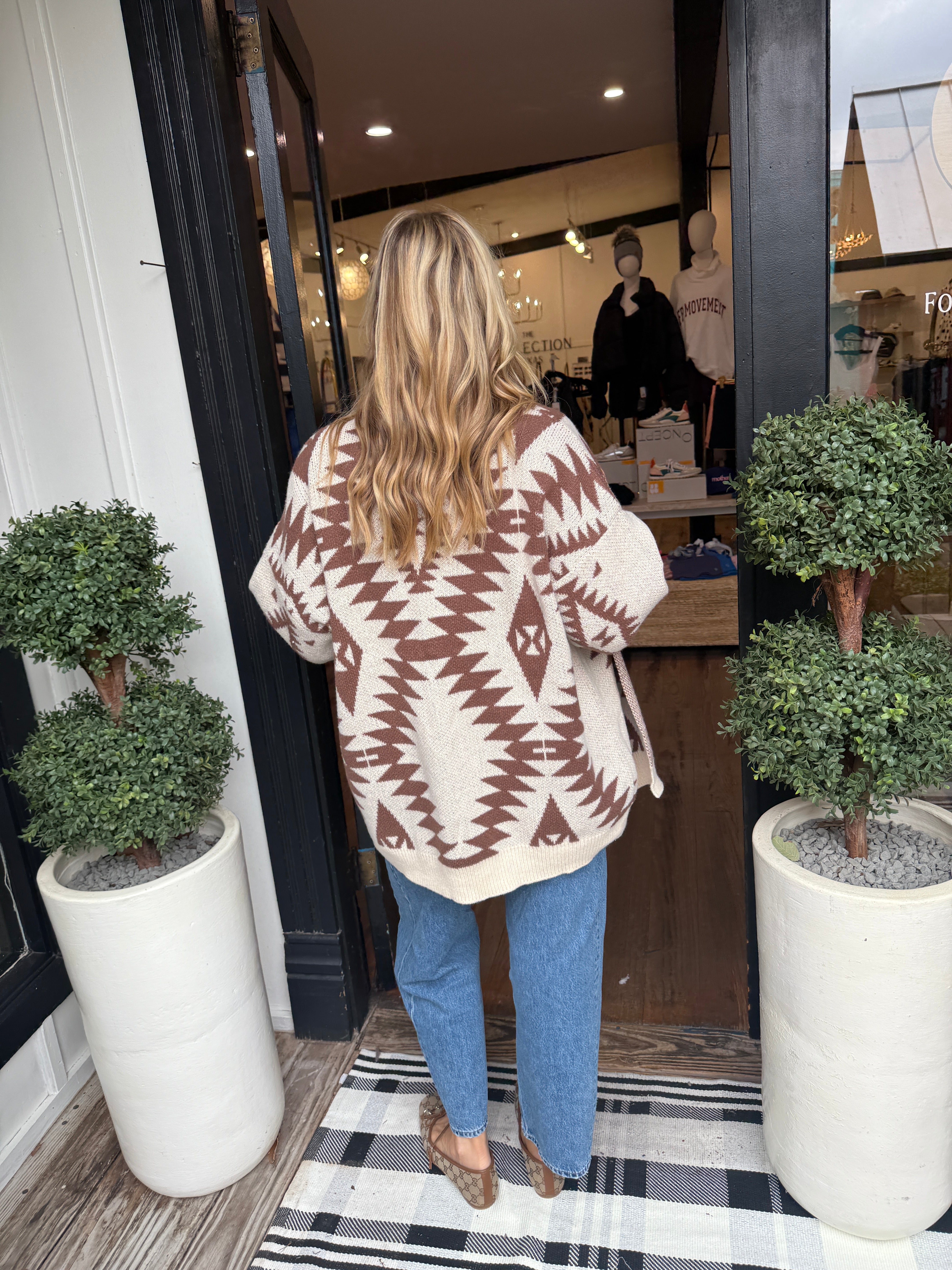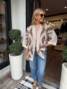 The Whitney cardigan is a cozy statement piece featuring a beautiful cream base with rich brown Aztec-inspired detailing. Designed in a relaxed, one-size-fits-most fit, it drapes effortlessly for comfort and easy layering. The warm neutral tones make it versatile enough to pair with denim, boots, or your favorite everyday basics. Perfect for adding a touch of rustic charm and timeless style to any outfit, the Whitney cardigan blends comfort with standout design.