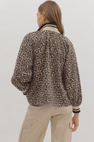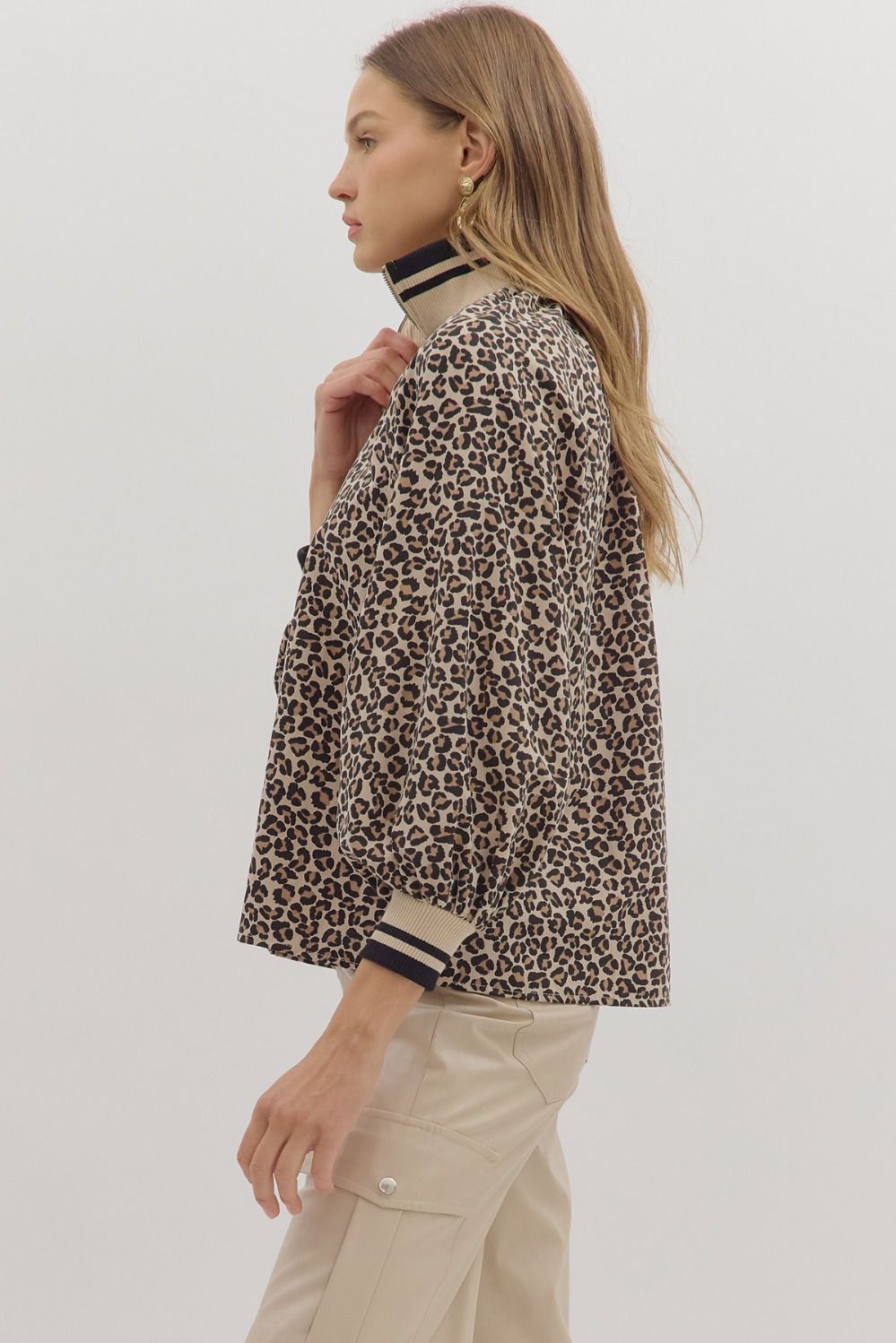 This leopard print long sleeve top is fierce and sophisticated with its zip-up mock neck and sleek silhouette. Crafted from a medium-weight woven fabric, it offers structure while staying comfortable and breathable. The front zipper closure adds a modern edge, making it easy to style for day or night.