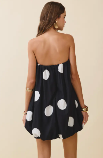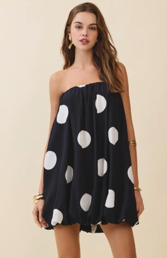Make a playful yet chic statement in this strapless bubble mini dress. Featuring a bold oversized polka dot print on a sleek black base, this dress brings a fun retro vibe with a modern twist. The voluminous silhouette drapes effortlessly from the elasticized neckline, cinching softly at the hem to create a flirty bubble effect. Perfect for summer parties, date nights, or a night out with friends, this dress pairs beautifully with gold accessories and strappy heels.