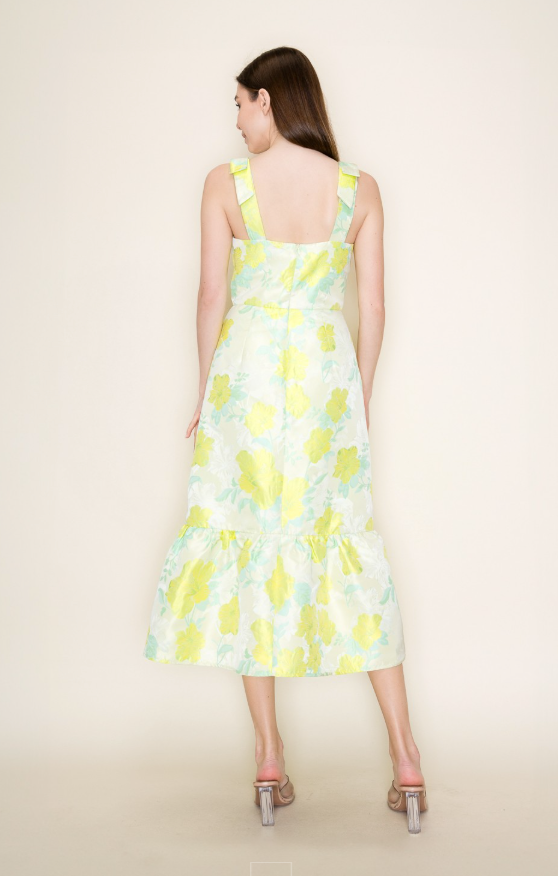 Bright, bold, and bursting with charm, The Citrus Bloom Midi dress sun-soaked showstopper. Made from floral jacquard in vibrant shades of lime and lemon, this sleeveless midi dress brings a fresh twist to feminine dressing. Sweet bow details sit at each strap, adding a playful touch to its tailored silhouette. Perfect for garden parties, brunch dates, or any moment that calls for a splash of joy.