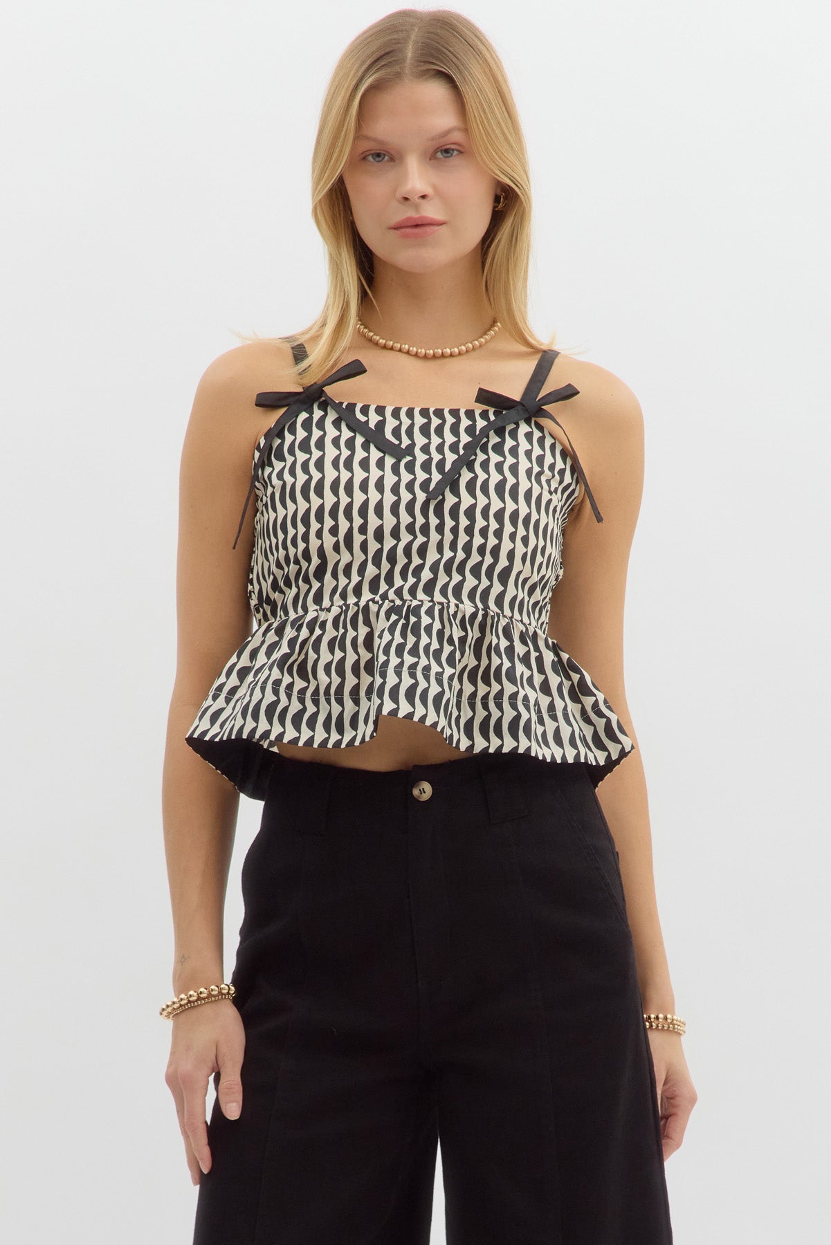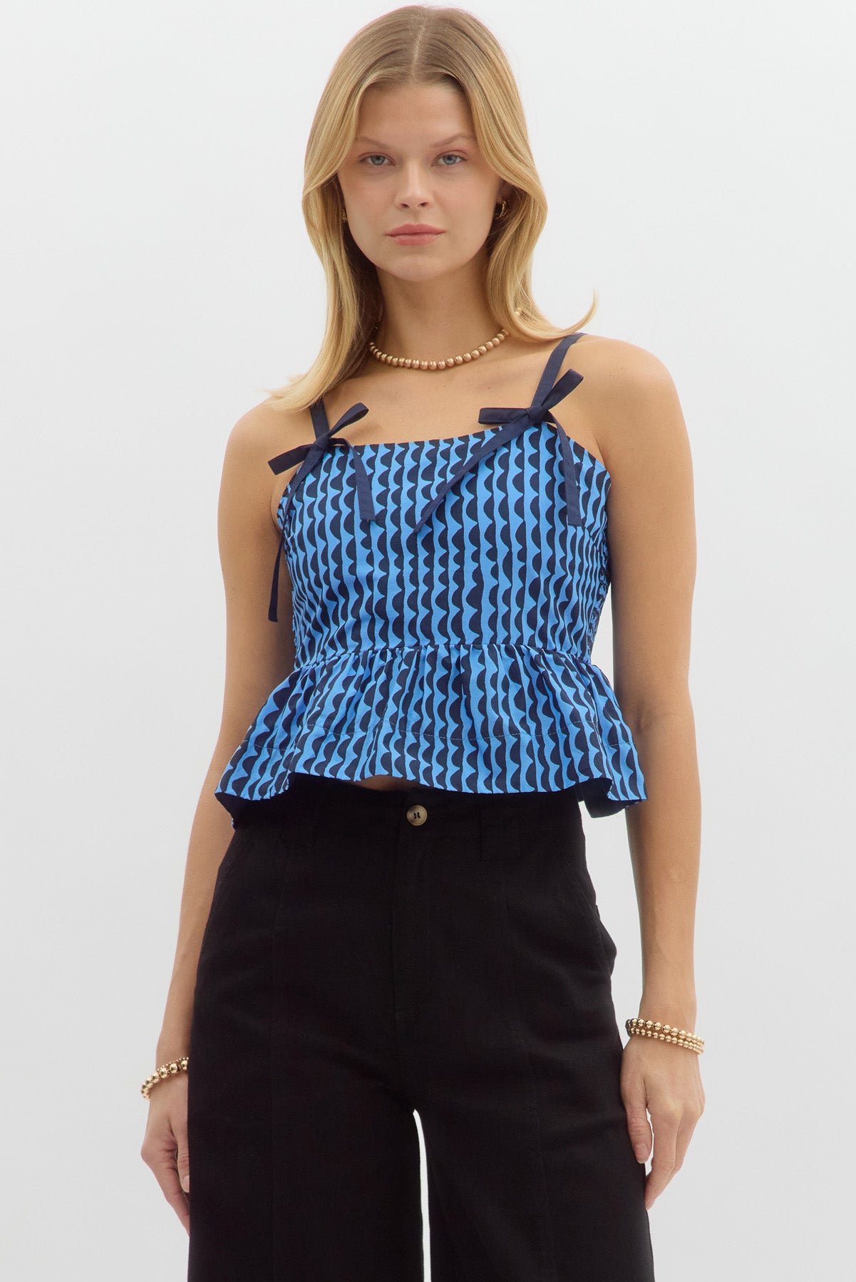 Introducing the Clancy Top - a printed pullover with a peplum design that effortlessly accentuates your curves. The adjustable shoulder straps and smocked back panel provide a perfect fit, while the lightweight, non-sheer fabric keeps you cool and comfortable all day. Keep it playful with a charming bow detail at the front.