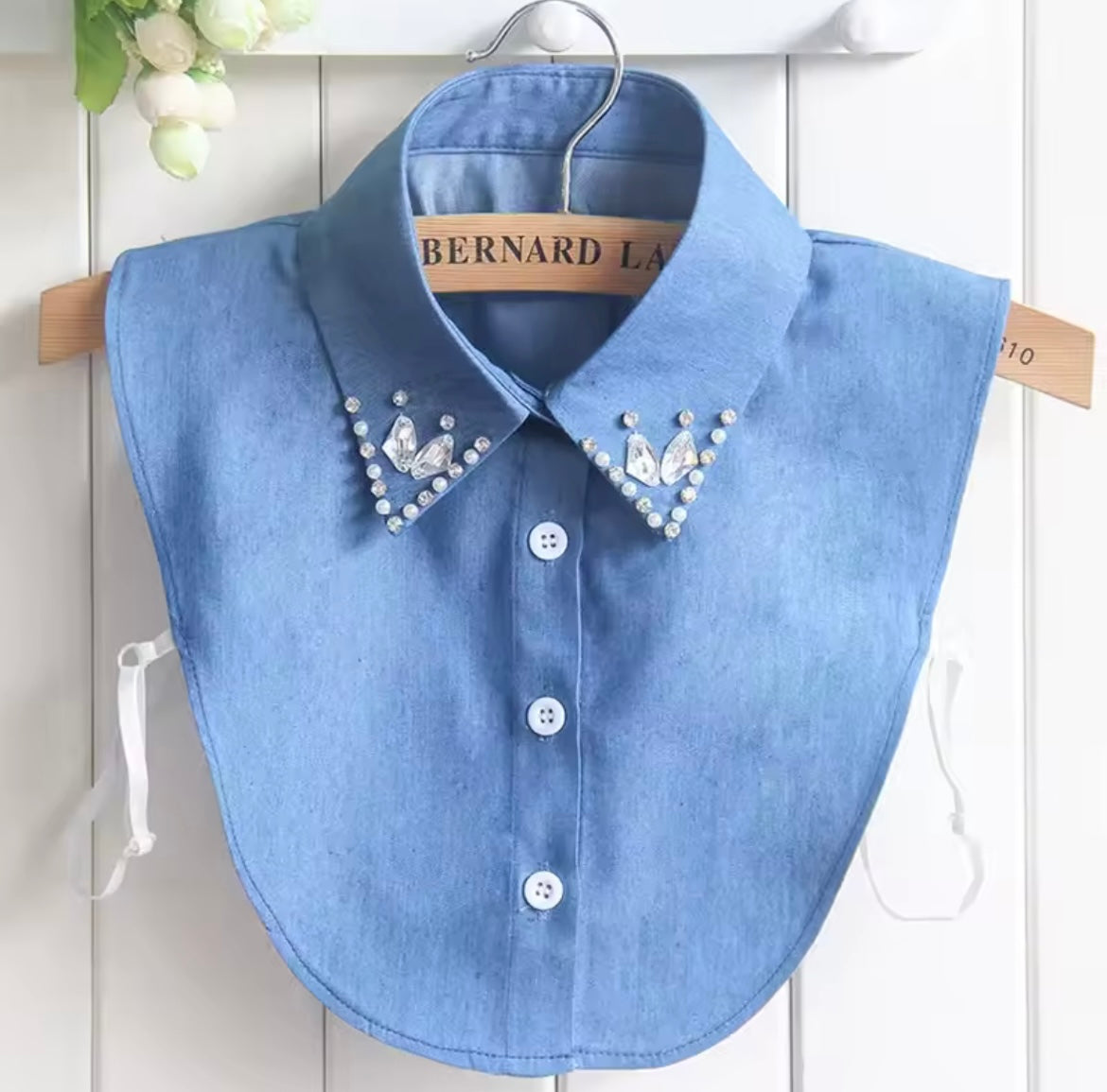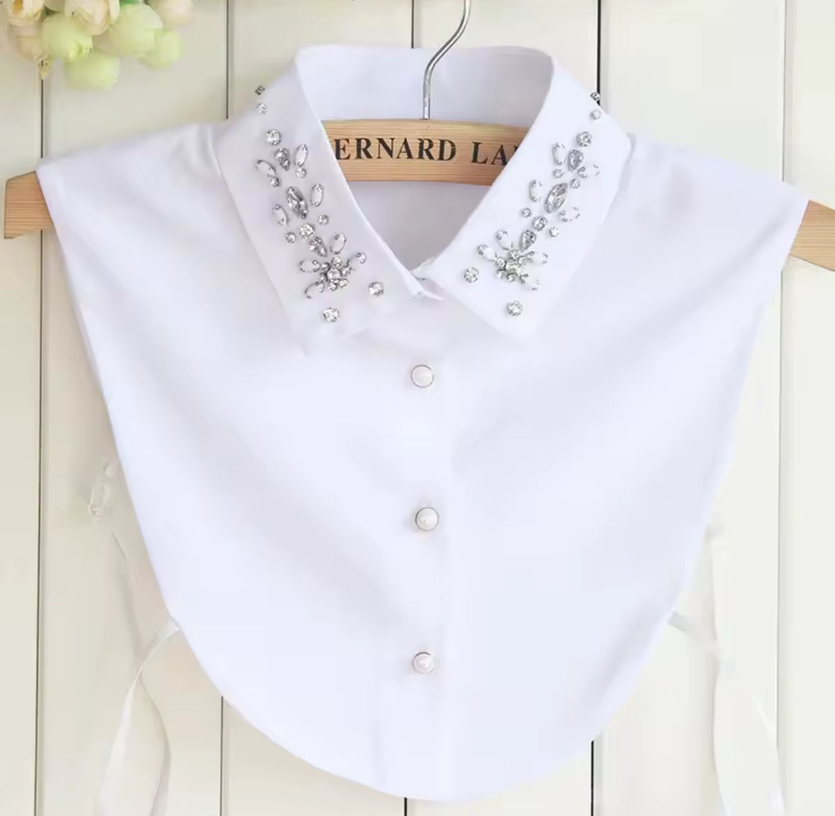 This ladies' fake collar is the perfect accessory to add a touch of elegance to any outfit. Made with water drop imitation crystals and chiffon fabric, it features rhinestone lapels and detachable buttons for easy customization. Enhance your wardrobe with this beautiful and versatile piece.