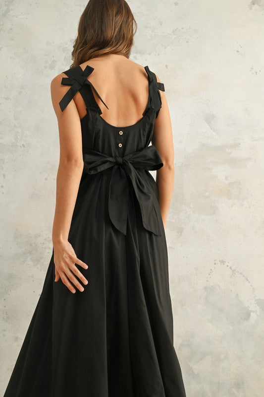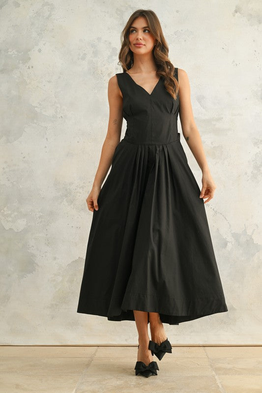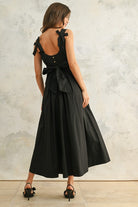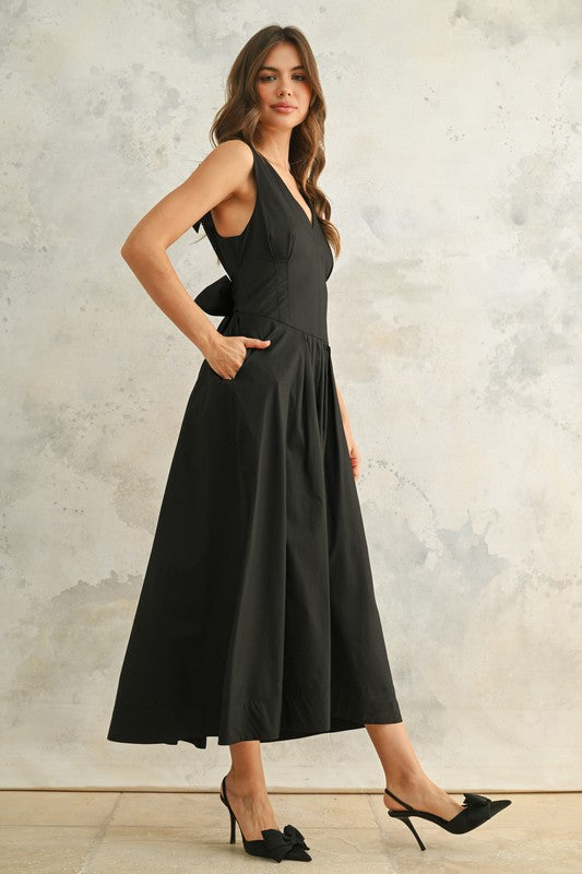 Turn heads in this bow detail woven dress crafted to flatter and impress. Featuring a sleek V-neck that elongates the silhouette. This dress offers effortless elegance for any occasion. The midi length offers graceful movement and versatile wear from cocktail events to romantic dinners.