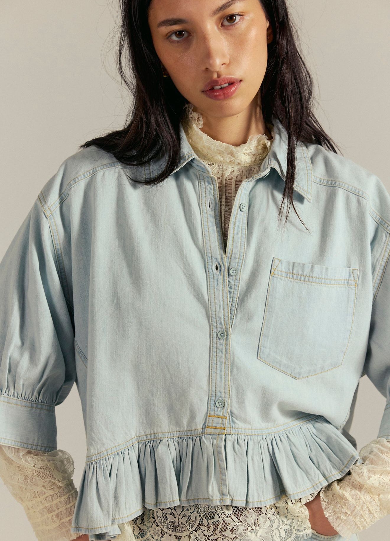 A classic denim shirt with a little something extra, featuring a ruffled hemline and short balloon-style sleeves.
