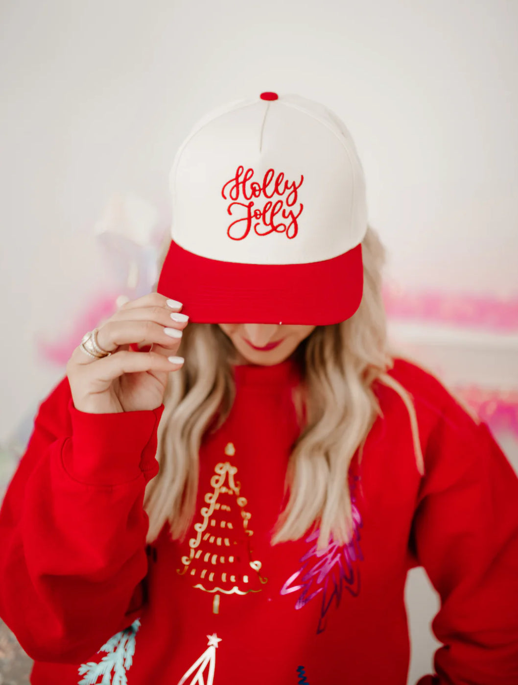 The hat has a classic trucker style with a structured front panel in a festive red, and a breathable white mesh back. The front features “Holly Jolly” written in elegant, flowing script, bringing a cheerful, holiday vibe. The text is in a snowy white or sparkling silver, giving it a hint of winter magic. The red bill completes the look, adding a pop of color, while the adjustable snapback makes it a comfortable, one-size-fits-all accessory, perfect for spreading Christmas cheer in a casual, fun way.