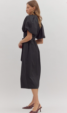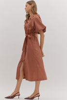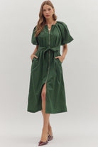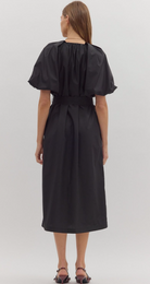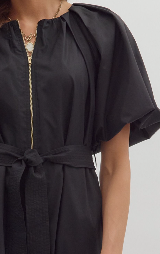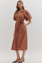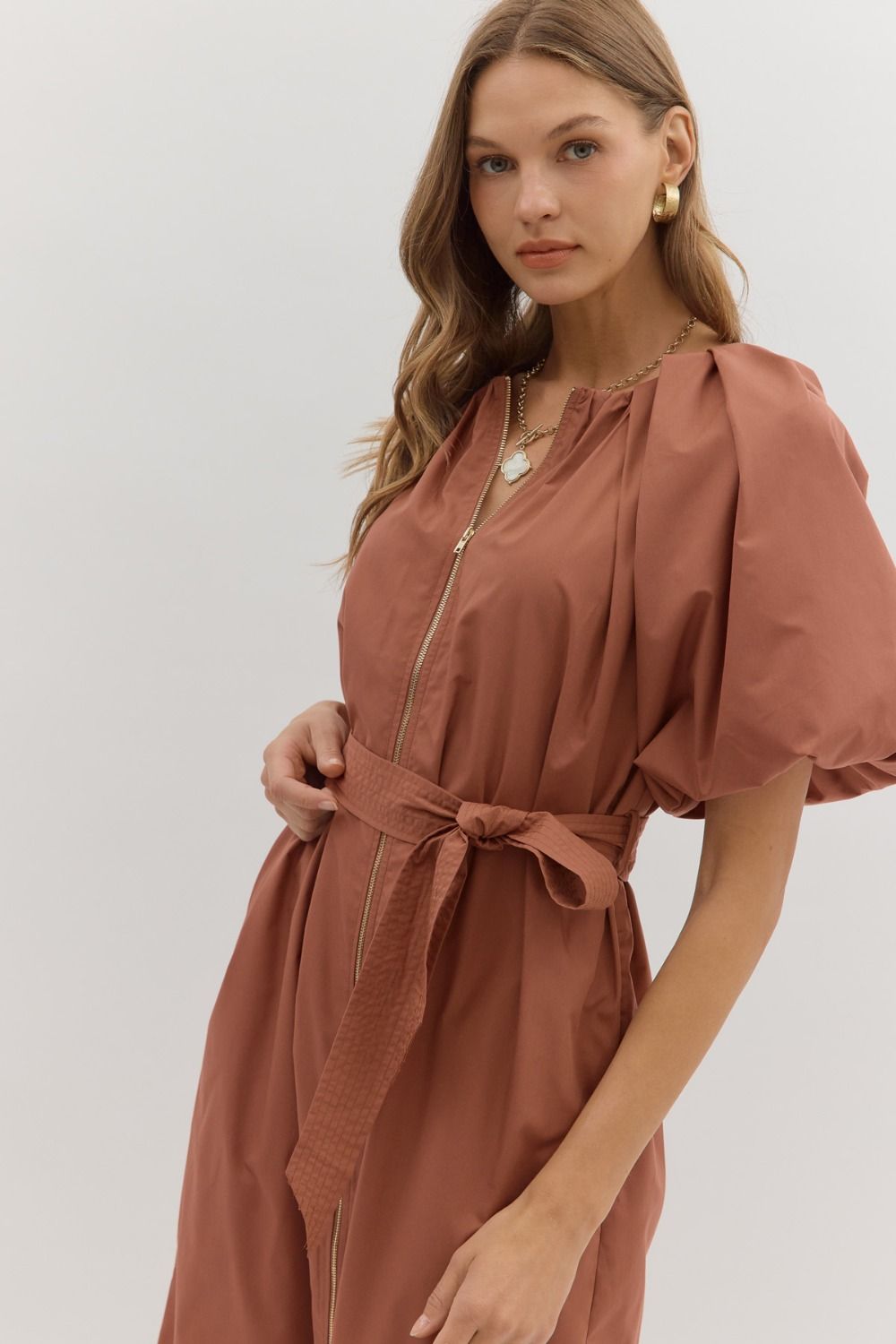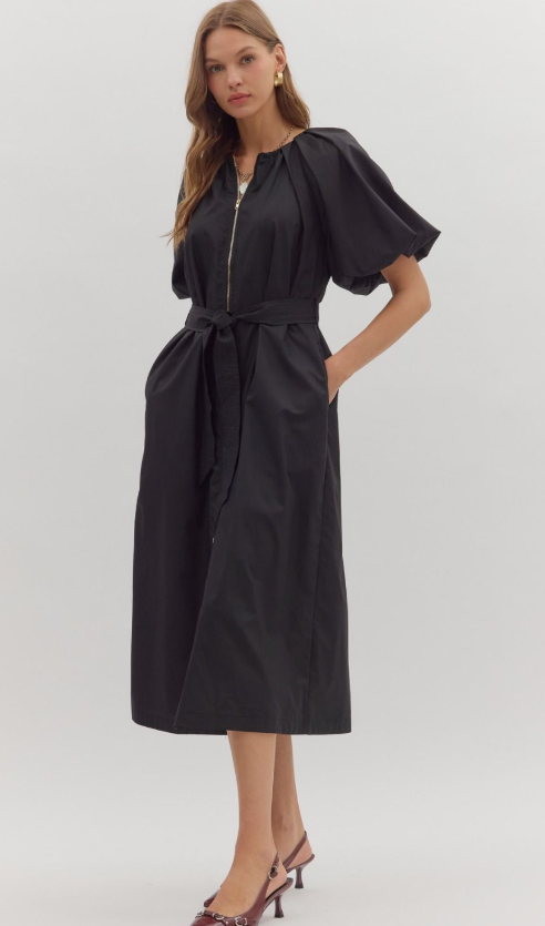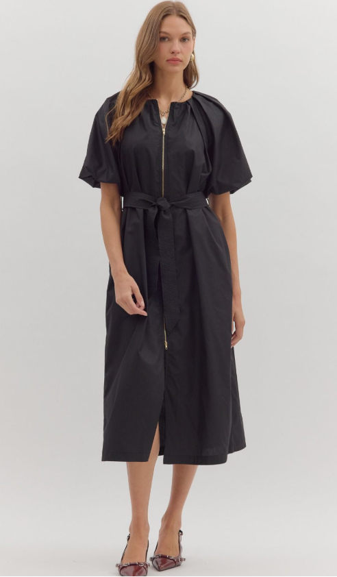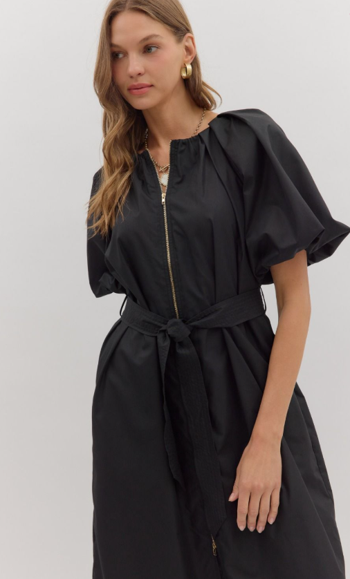 Effortlessly chic, this solid puff sleeve midi dress is designed with a softly gathered neckline and an exposed front zipper for a modern touch. The removable self-tie belt lets you define your waist, while side pockets add everyday ease. Fully lined and lightweight, it’s the perfect balance of polished and practical — a go-to for dressing up or down with ease.