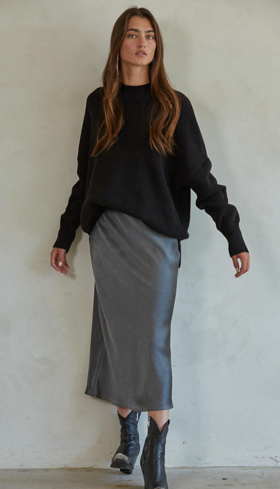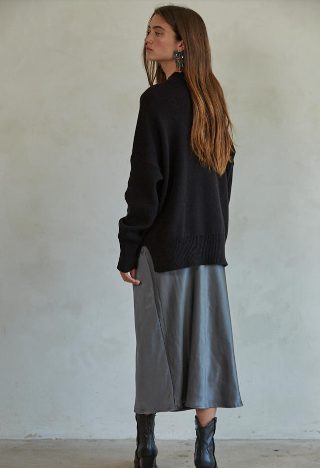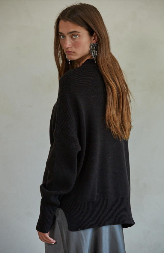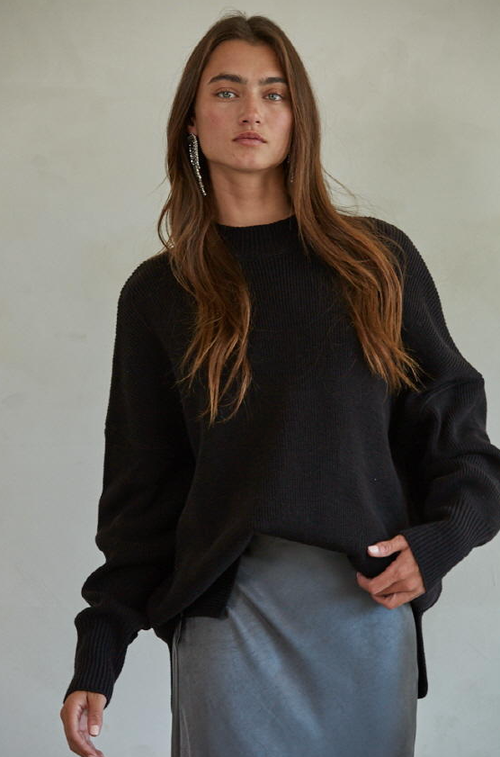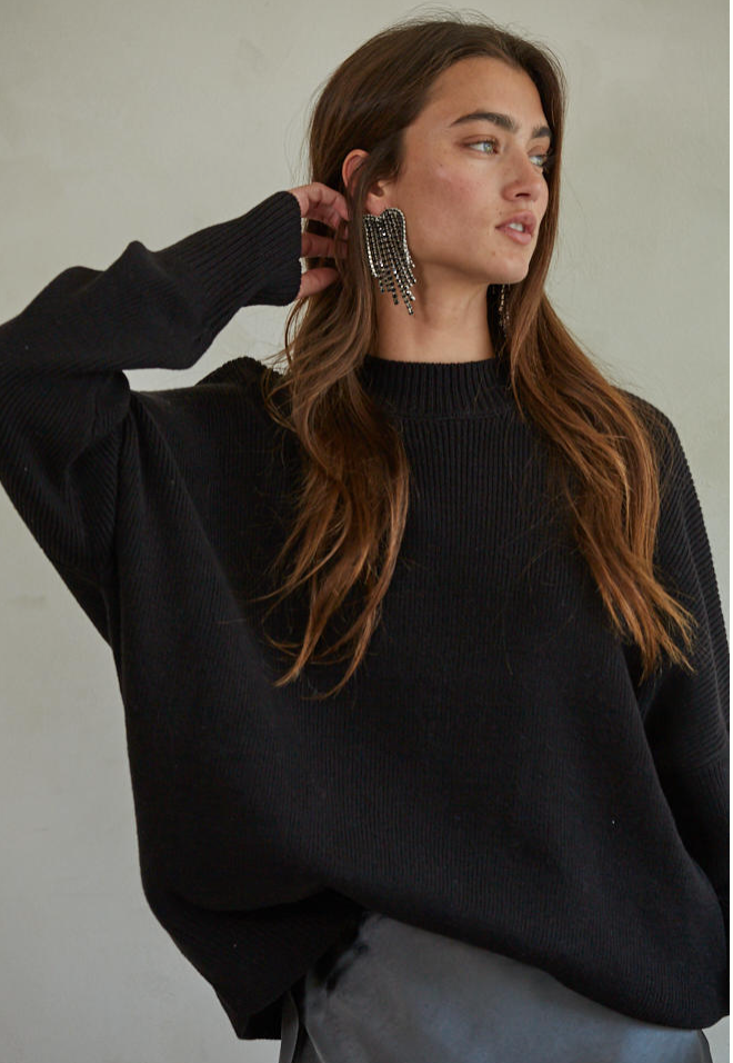 Cold days call for cozy layers, and this black pullover sweater delivers in style. Featuring a chunky knit texture, long sleeves, and a high neckline, it's the perfect blend of warmth and effortless edge. The oversized fit gives it that laid-back, lived-in look—ideal for pairing with leggings, denim, or layering over a slip dress. Whether you're lounging at home or heading out, this sweater wraps you in comfort while keeping your outfit on point.