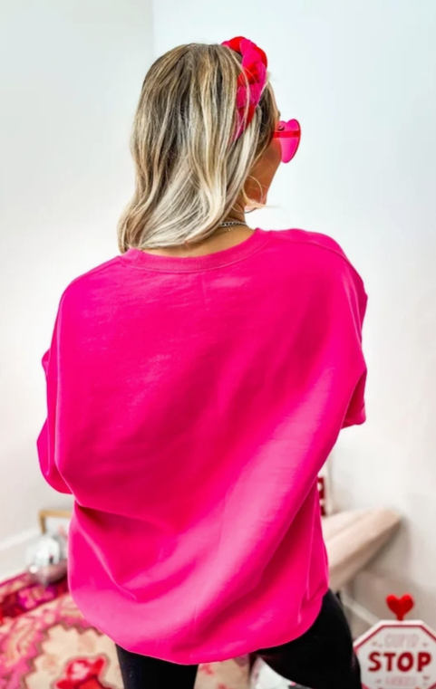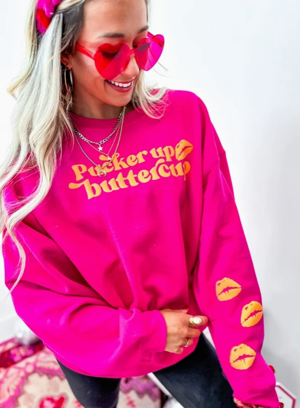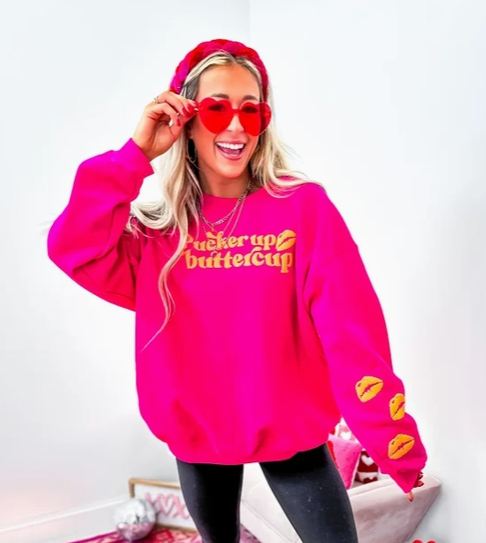 Add a pop of personality to your wardrobe with this playful Pucker Up Buttercup graphic crewneck. Designed in a vibrant heliconia pink hue, this cozy sweatshirt brings fun, color, and comfort together in one standout piece. The bold, cheeky graphic adds a flirty touch, while the classic crew neckline and relaxed fit make it perfect for everyday wear.