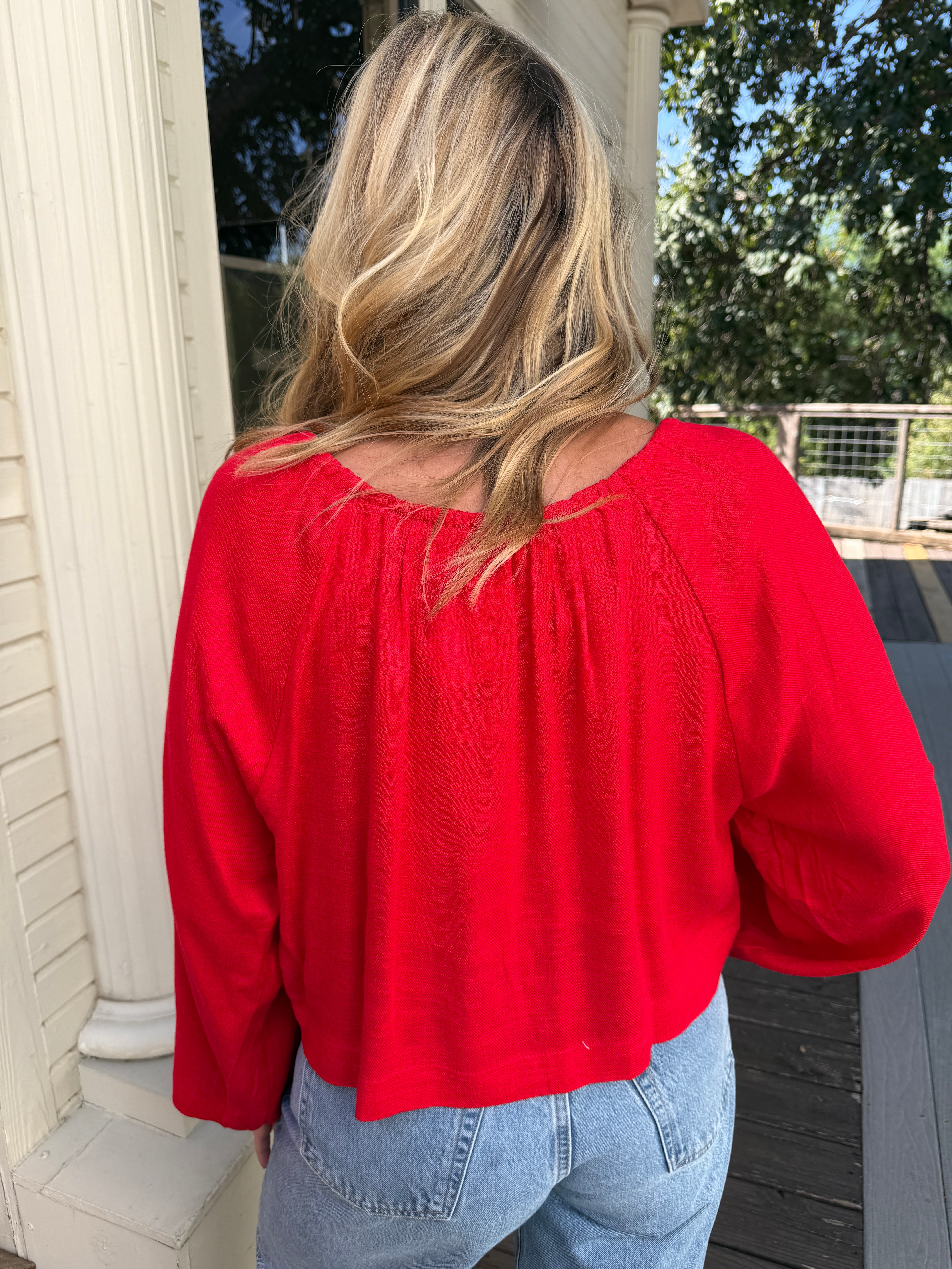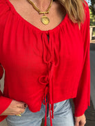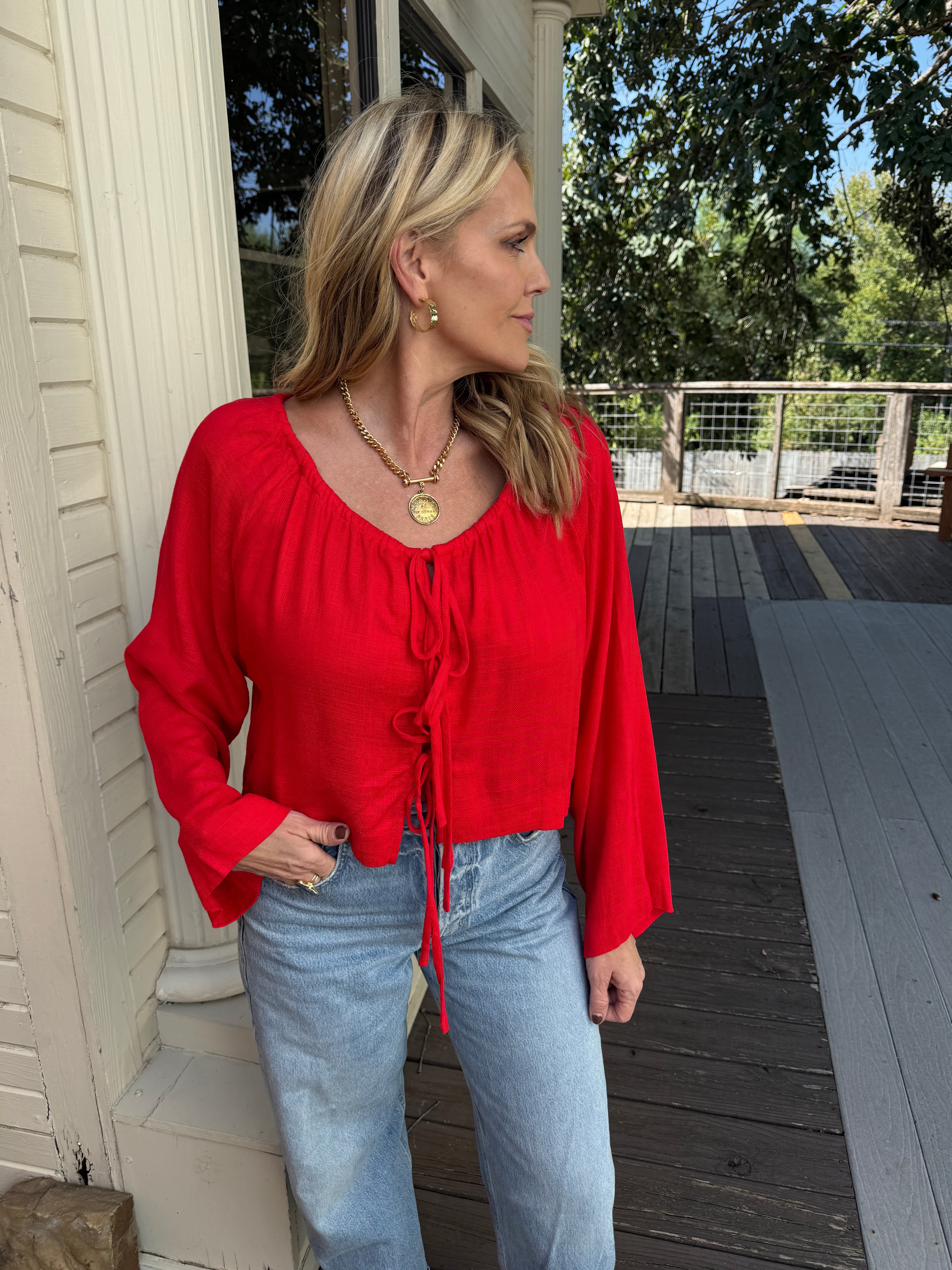 This red long-sleeved top is flirty, feminine, and effortlessly chic. Made from a soft, lightweight fabric, it features a round neckline and a slightly longer cropped fit that flatters without showing too much. Three delicate bow ties run down the front, adding the perfect touch of charm and detail. The fit is easy and breathable — ideal for pairing with high-waisted denim, skirts, or layered under a jacket for a pop of color. A statement piece that’s simple yet full of personality. ❤️