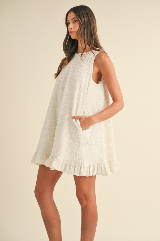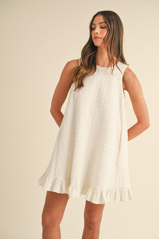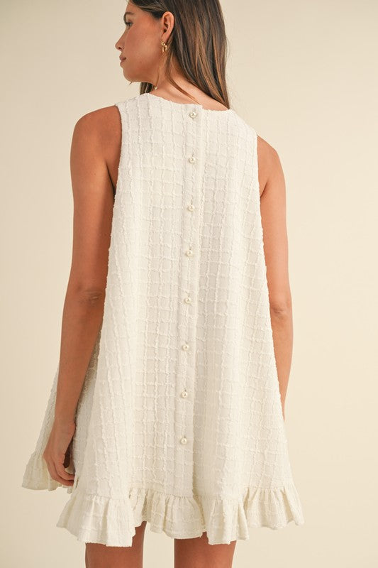 Flirty and fun, this sleeveless textured mini dress brings the charm with ruffled detailing and a statement button-back design. Lightweight and breezy, it’s your go-to for sunny days, date nights, and everything in between.