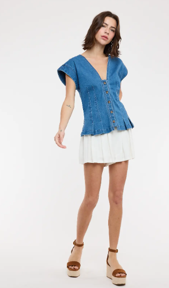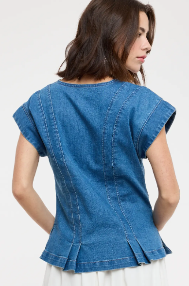 Crafted from comfortable, lightweight denim, it offers a relaxed yet polished fit that pairs beautifully with everything from tailored trousers to casual shorts. The subtle pleated design creates a flattering drape, giving this wardrobe staple a refined, fashion-forward touch.
