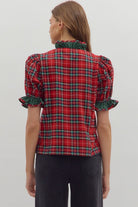 Classic plaid gets a feminine twist in this puff sleeve top. Featuring contrast ruffle trim and a snap button closure at the bust, it blends playful detail with timeless style. Lightweight and woven, it’s non-sheer and easy to wear from day to night.