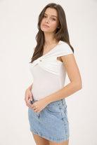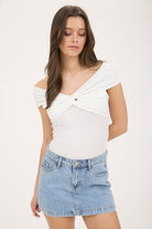 Effortlessly flirty and chic, this off-the-shoulder twist front knit top in crisp white is the perfect blend of sweet and sassy. The twist detail adds a playful touch, while the off-the-shoulder neckline shows just the right amount of skin. Pair it with high-waisted jeans, flowy skirts, or tailored shorts for everything from brunch dates to summer nights out. Add dainty gold jewelry and a cute heel or sandal, and you’re ready to turn heads with minimal effort!