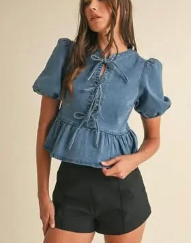 Introducing The Everyday Top - your go-to denim puff sleeve! With three bow ties in the center, this top is equal parts cute and chic. Wear it any day, any way (maybe even with your hair in a messy bun #wokeuplikethis). A staple in any wardrobe!
