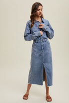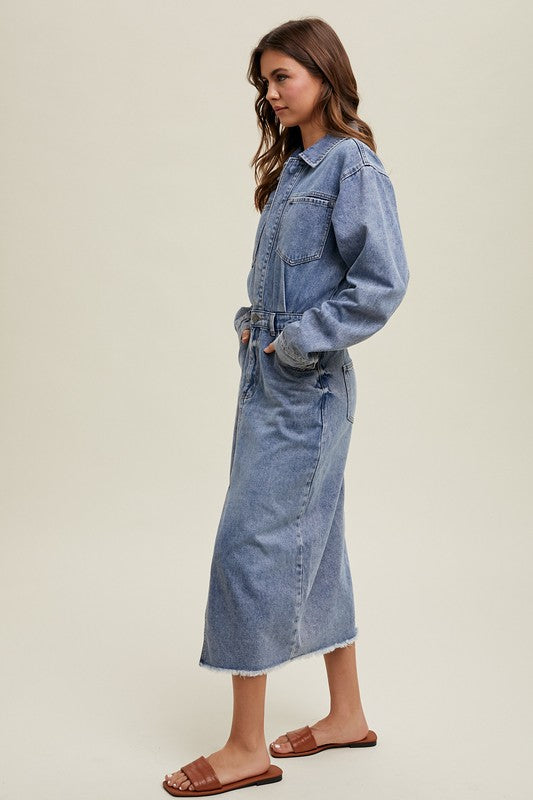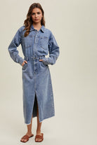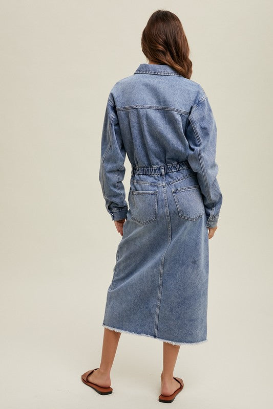 Crafted from washed denim, The Thea Dress is a versatile addition to your wardrobe. Its functional buttons, zip closure, and belt loop make it easy to wear and style. With an elastic back waistband and pockets, this midi dress offers both comfort and convenience.