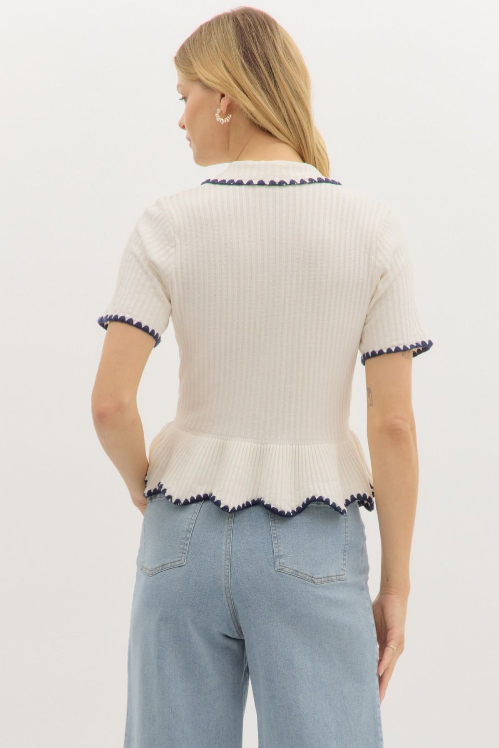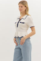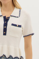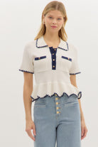 Polished yet playful, this solid sweater knit pullover top is detailed with a contrasting triangle stitch finish at the edges and chic gold-accented button closures down the front. Finished with front shirt pockets for a classic touch, this lightweight knit is the perfect blend of casual comfort and elevated style. Pair it with denim or tailored bottoms for a versatile look that works day to night.